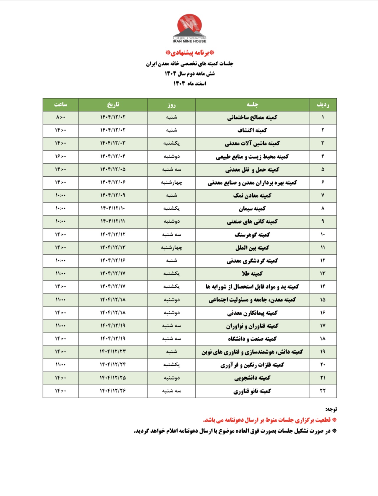 جدول زمانی 🔅پیشنهادی🔅 جلسات کمیته های تخصصی خانه معدن ایران در اسفند ماه ۱۴۰۴